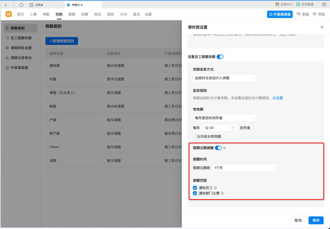 管理员可以在假期管理中设置假期到期的提醒,支持给员工或部门的主管发送到期提醒,帮助组织成员合理安排作息时间。