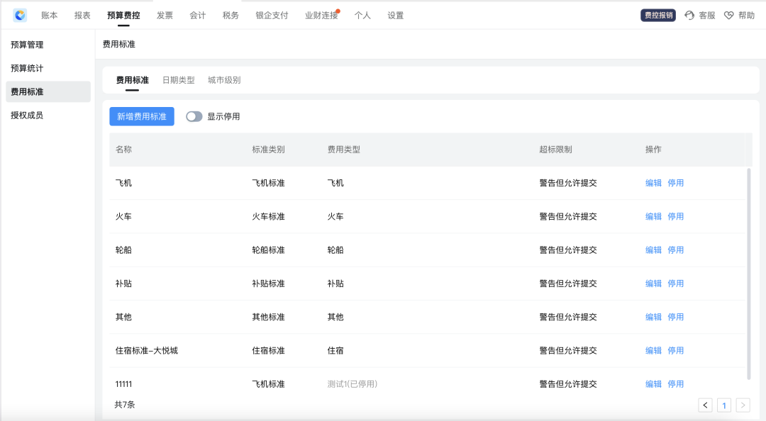 支持管理员通过「工作台 - 智能财务 - 预算费控 - 费用标准」设置交通、酒店、补贴等费用标准。