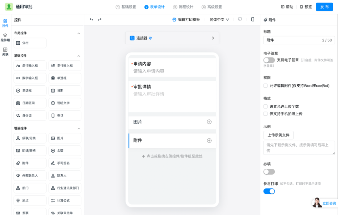 支持对审批「附件」字段进行在线编辑、上传示例文件、限定上传个数、仅支持手机拍照上传等设置,附件使用更高效。