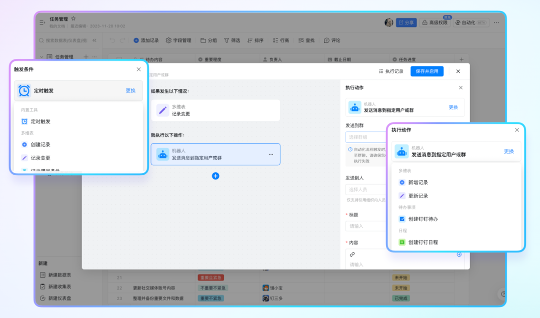 「自动化」功能上线,通过简单的配置,即可在多维表内自动化完成各种重复琐碎的任务,解放双手,轻松提升办公效率。