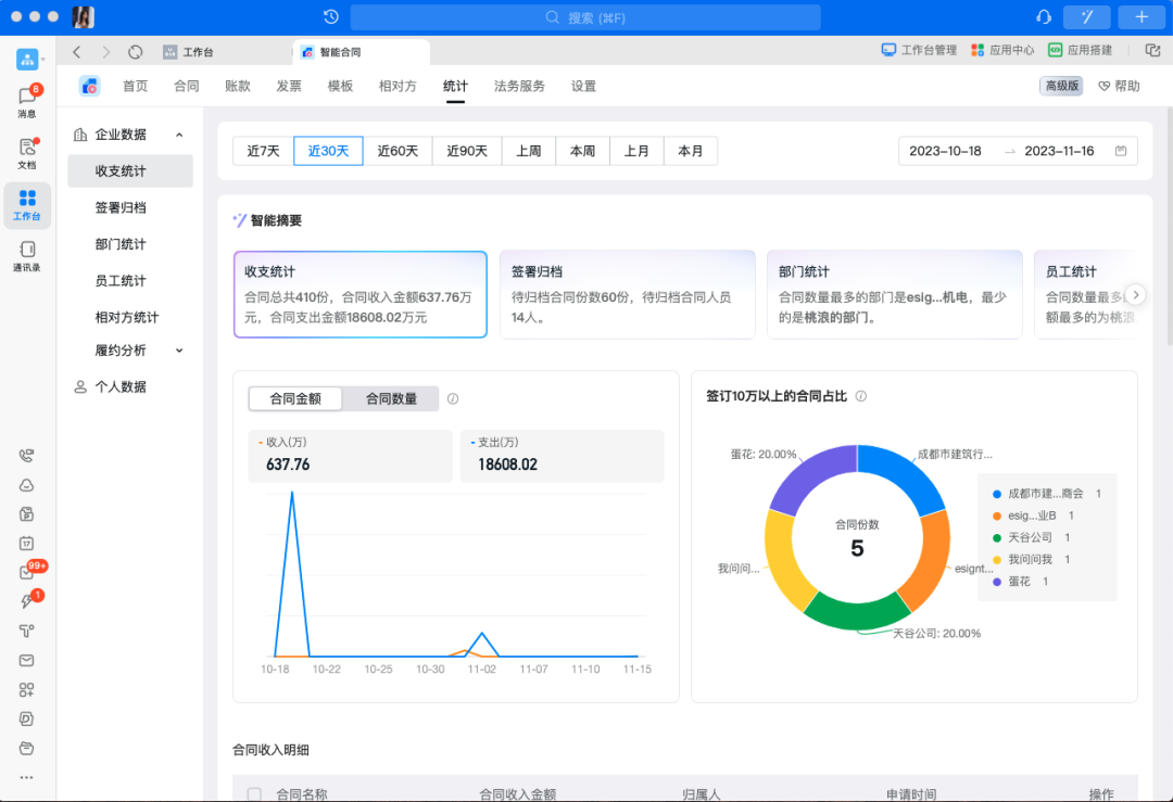 新增合同数据统计报表,支持对合同收支、签署归档、部门、员工、相对方、履约等数据进行多维度结构分析。