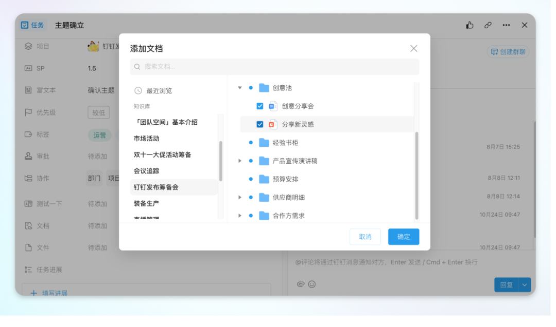 支持在「钉钉文档」字段中按目录层级添加文档,提升内容的查找效率。