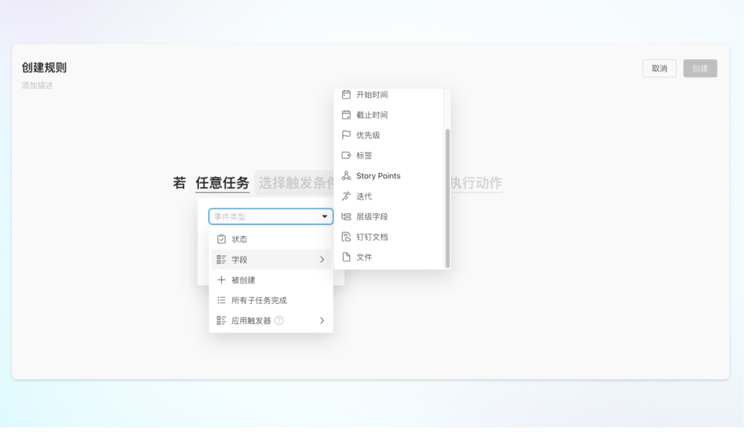「自动化」规则的适用范围全面升级,支持「文件」「钉钉文档」「层级字段」类型字段,自动化流程的执行效率与准确性提升。