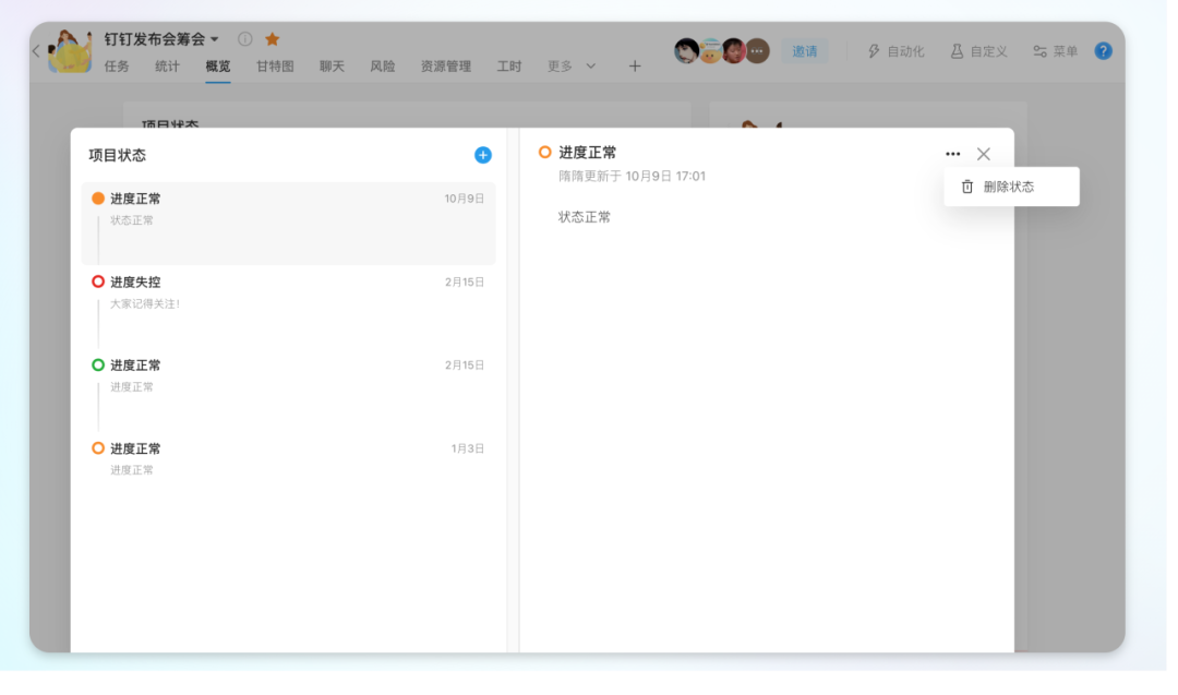 「项目集」和「项目」中的项目状态均支持删除,支持根据实际情况对项目状态进行删除调整。