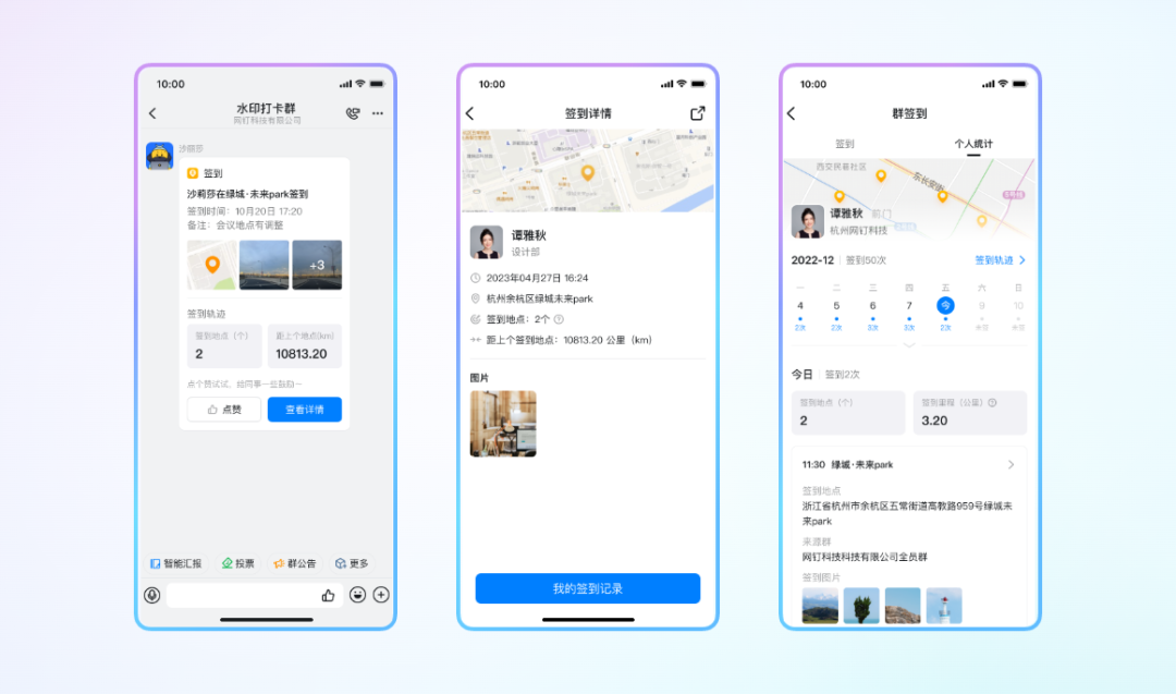 群签到新增签到地点数、当日总里程等新数据,更直观、更详细地展示员工的签到状态和轨迹。