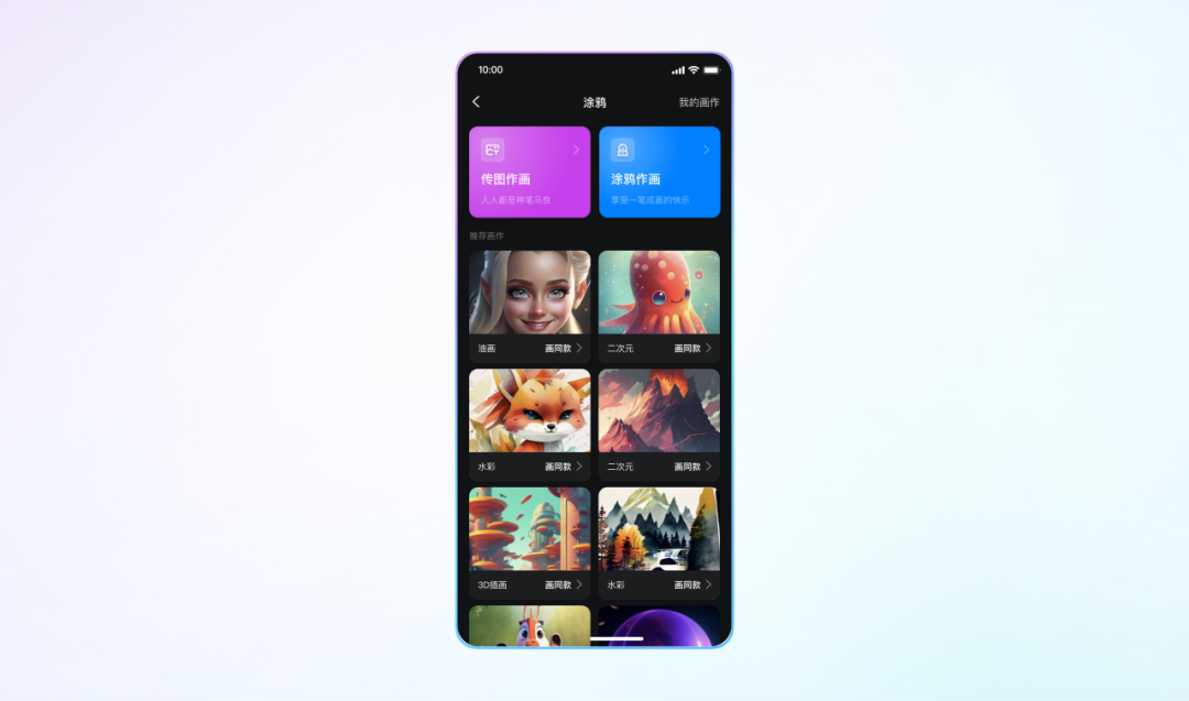 支持随手涂鸦和传图作画,支持选择多种独特风格,一键生成独一无二的好看图片,让手机瞬间变成移动的艺术工作室。