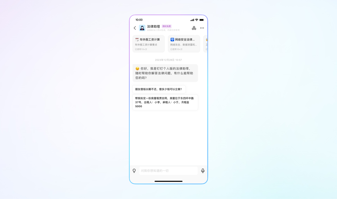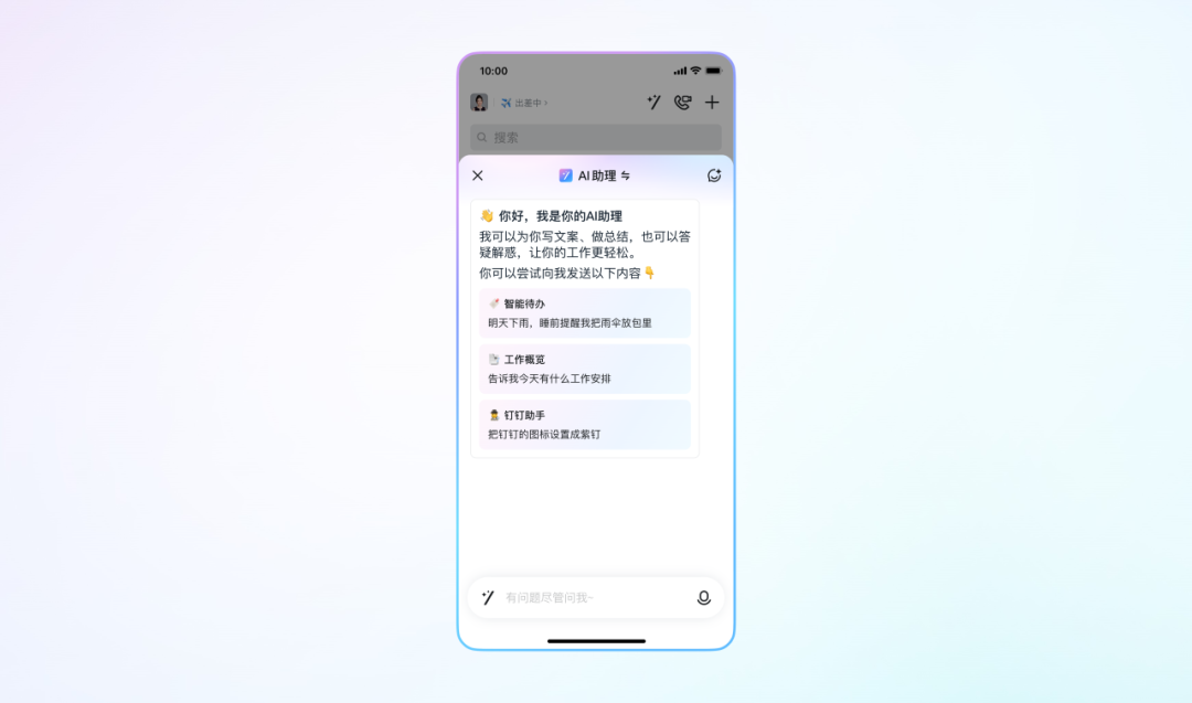你的超级助理重磅来袭!钉钉功能直达、总结工作、智能创作、一句话请假/建待办/建日程……轻松对话,AI助你高效办公。