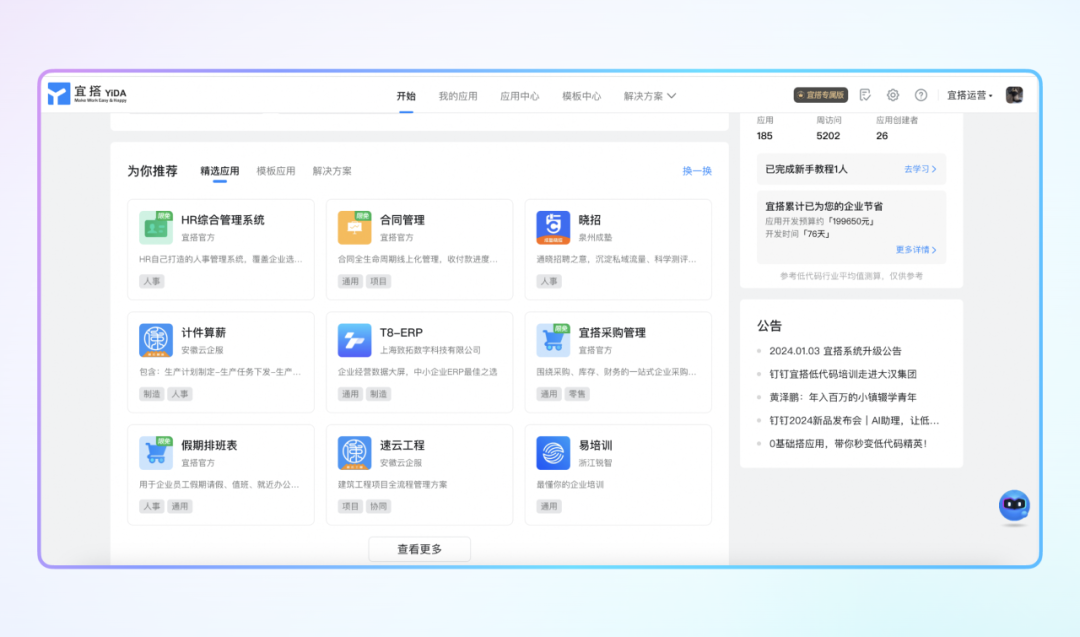 新上架 5 个免费精选应用,支持开箱即用;宜搭付费版组织支持对应用全部功能进行个性化扩展。