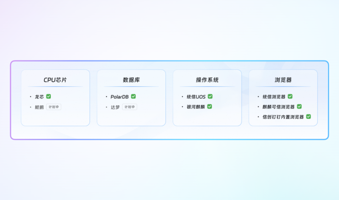 宜搭专属版支持主流信创产品适配认证,满足更多国央企、医疗、政务等特殊行业的信息安全合规要求。
