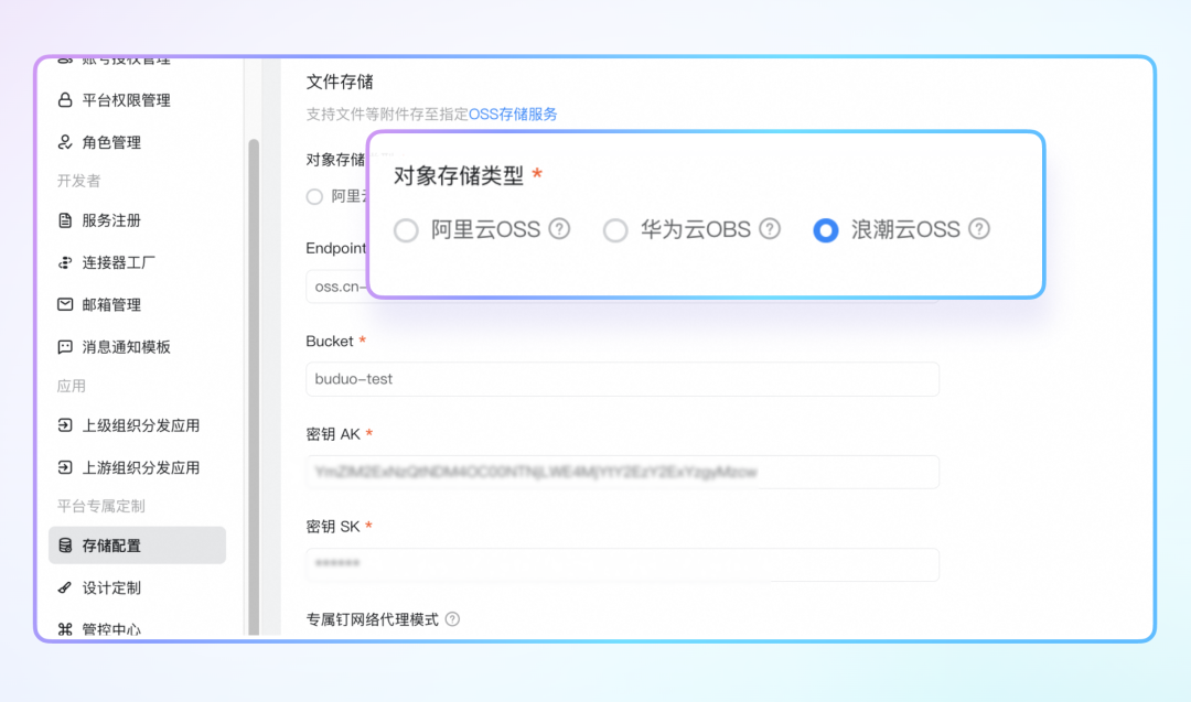 宜搭专属版新增浪潮云 OSS 支持,目前附件存储覆盖阿里云 OSS(含阿里云 Mini OSS)、华为云 OBS、浪潮云 OSS,满足更多文件存储需求。