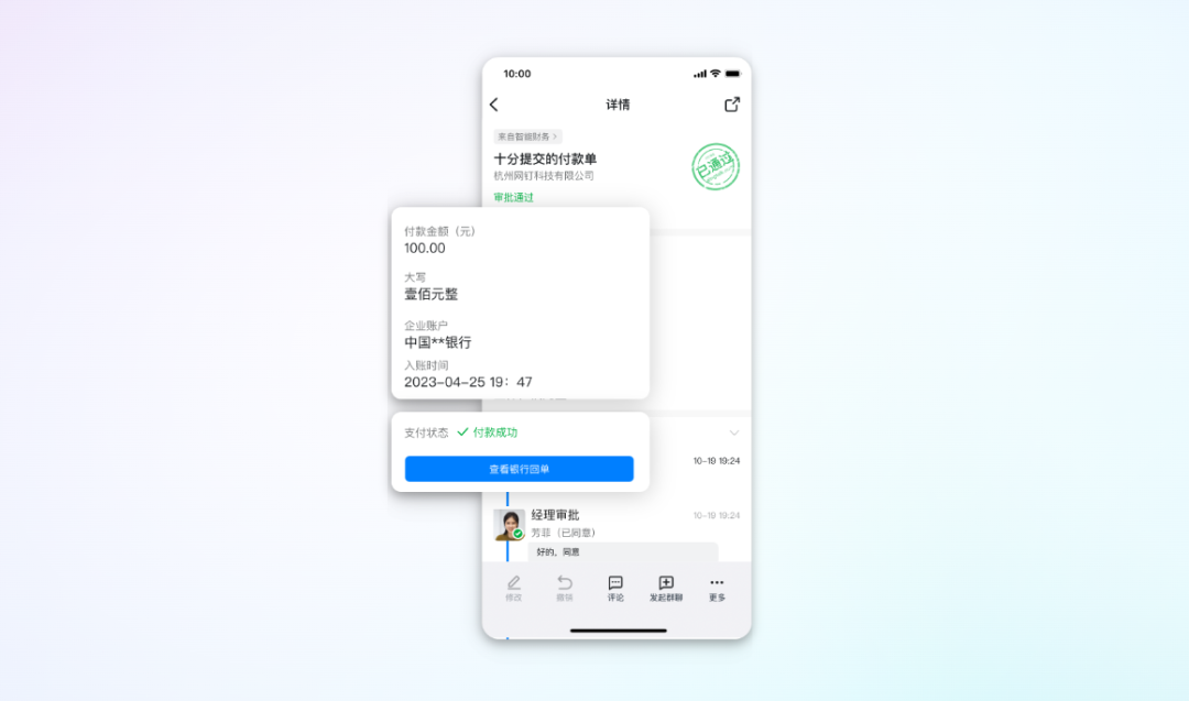 在钉钉上审批通过后,点击确认支付,即可将审批单推送到银行,网银侧确认支付成功后,审批流内自动回传银行回单,审批支付一体化,审批流程更高效。