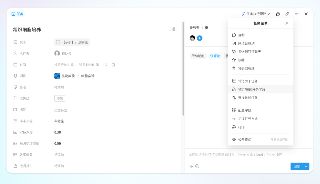 Teambition 新增对逐个项目任务字段进行锁定的能力,帮助团队更精细地管理任务,提升流程管控效率。