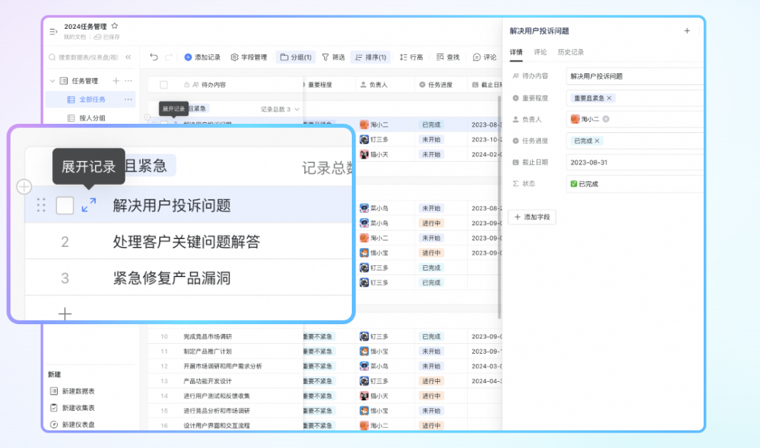 多维表的「行详情页」支持从侧边栏打开,并可拖拽调整大小,让编辑更友好,阅读更便捷,提高信息浏览效率。