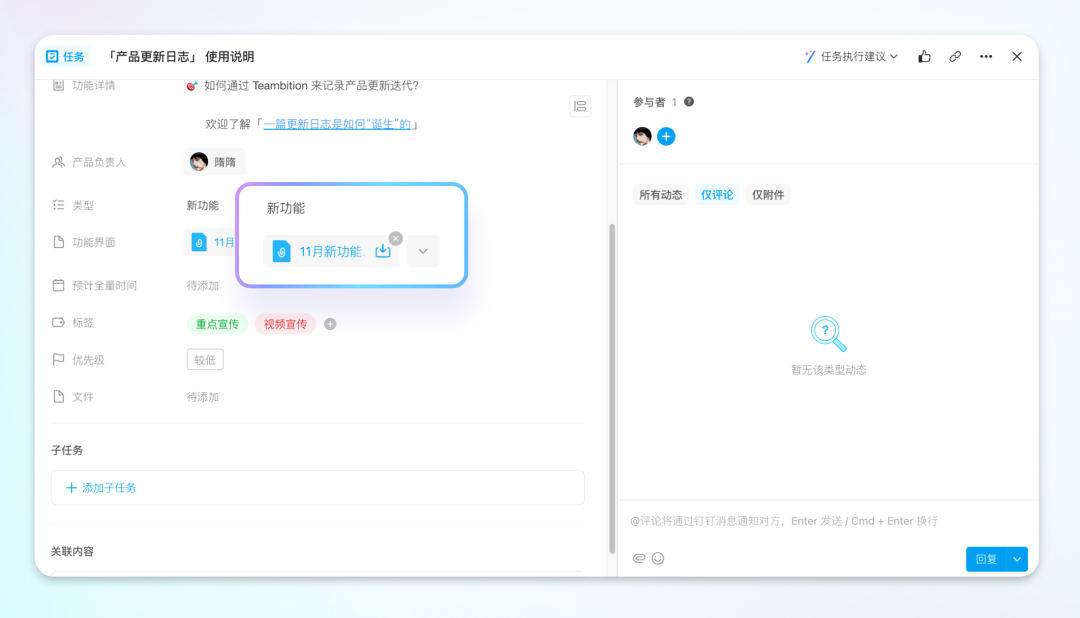 支持在任务详情页直接下载文件,只需将鼠标悬停至文件上,即可点击下载,大大提高了工作效率。