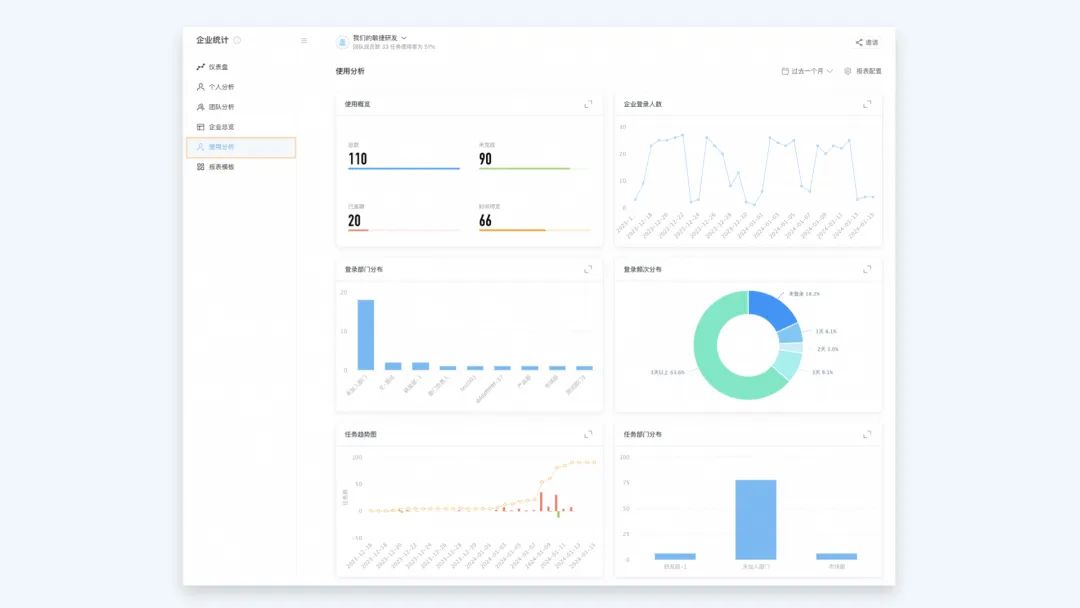 本次更新,「企业统计」新增「使用分析」看板,帮助管理员了解企业成员使用 Teambition 的基础情况,全面了解并追踪成员登录、任务完成效率等具体使用行为,进一步提升 Teambition 在企业内部的使用价值和工作效率。
