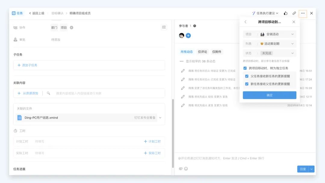 批量操作子任务时,无论是跨项目移动还是转化为其他任务的子任务,均支持父子任务存在于不同的项目中,从而满足更加复杂、灵活的多项目协同需求。