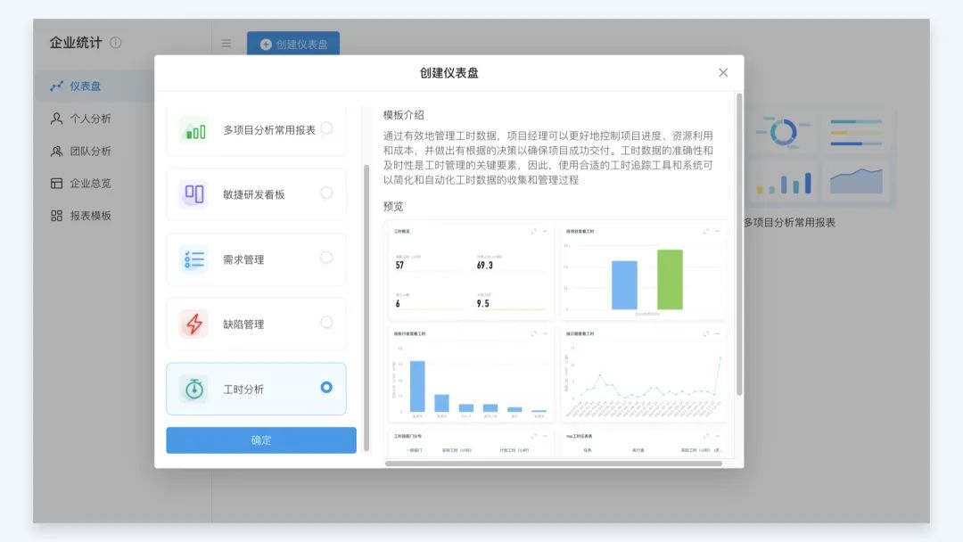 五、「仪表盘」增加「工时分析」模板