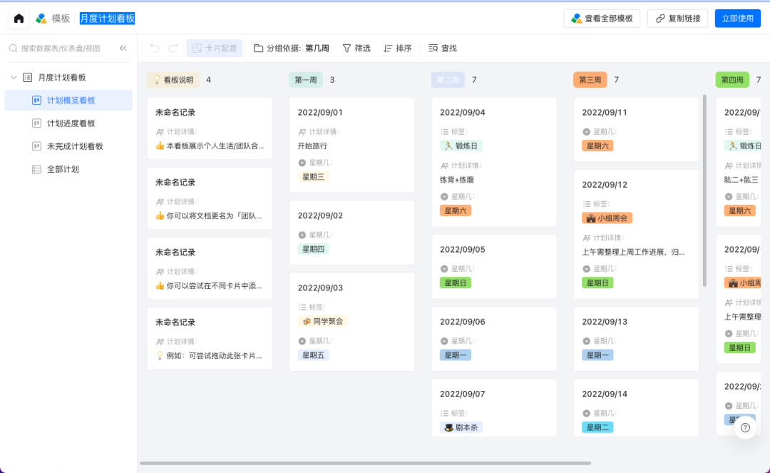 月度计划看板:走出拖延的阴霾,迎接计划的晴朗!钉钉文档带给您“月度计划看板”模板,专为拒绝拖延、追求效率的您量身打造,让我们一起打破时间的束缚,迎接有条不紊的工作生活吧!