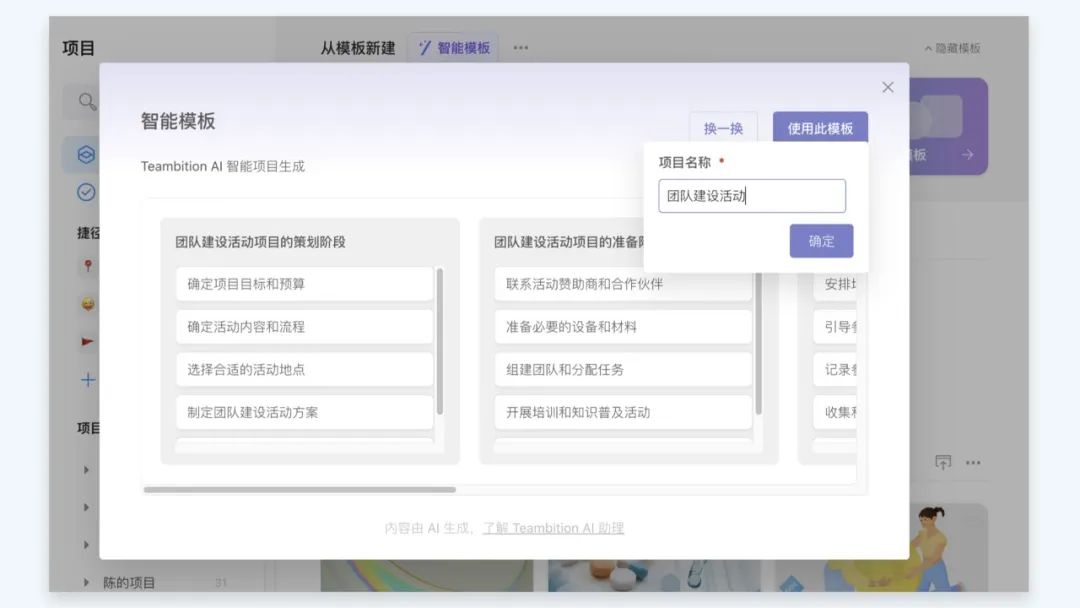本次更新,我们上线了个性化智能项目模板功能,用户进入 Teambition 首页,点击「智能模板」按钮,输入创建项目的需求,系统将自动分析并创建出符合该需求的详细项目列表结构以及任务清单。