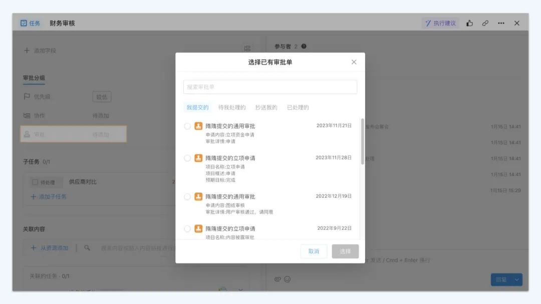 本次更新,我们扩展了「钉钉审批」字段的适用场景。用户点击审批字段后,可从「我提交的」、「待我处理的」、「抄送我的」以及「已处理的」四个分类下添加审批单,丰富了数据来源,提高了审批效率,提升了信息的一致性和准确性。