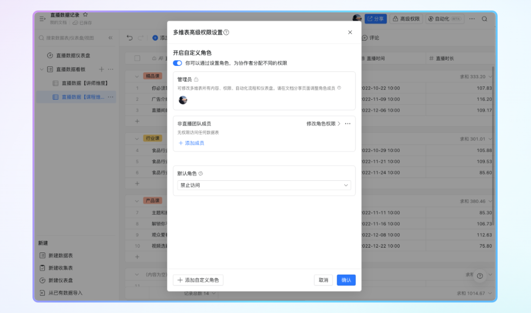 想要给多维表数据安全加把锁?小事儿,具有多维表管理权限成员,可在高级权限中通过不同的自定义角色,针对数据表、仪表盘设置相应权限,让权限管理精细化,数据安全更有保障。