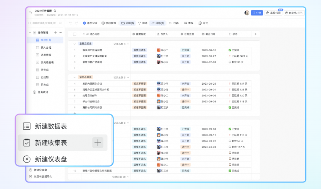 新年开工,想要快速收集员工返工等信息时,可在钉钉多维表中,一键快速建立数据收集表单,享受开箱即用的配置能力,可通过左侧工具栏管理隐藏题目,并且支持拖拽添加新题目,编辑更加便捷。