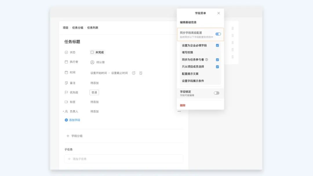 同时,我们支持将上述配置同步至项目中,用户开启「同步字段高级配置」后,所有引用该任务类型的项目中的任务字段将与企业的统一配置保持一致,确保成员在不同项目中遵循同一套标准化流程和规则。