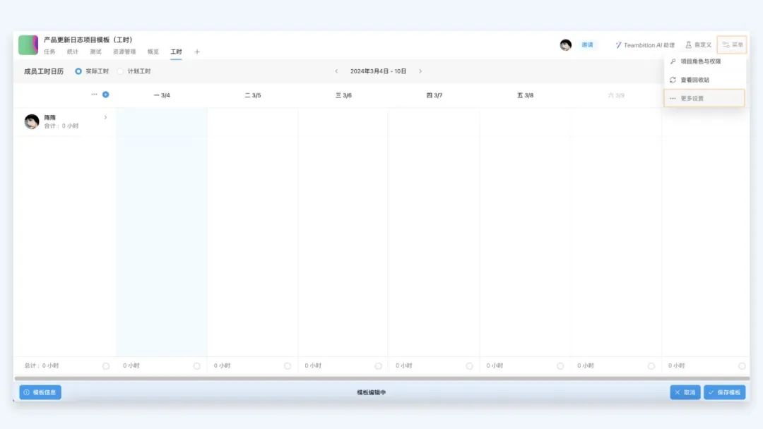 本次更新,我们支持在项目模板中预先配置工时相关设置,确保这些配置能应用到通过该模板创建的所有项目中。用户点击「项目菜单」-「保存为企业模板」进入项目模板配置界面 - 点击「菜单」- 更多设置。