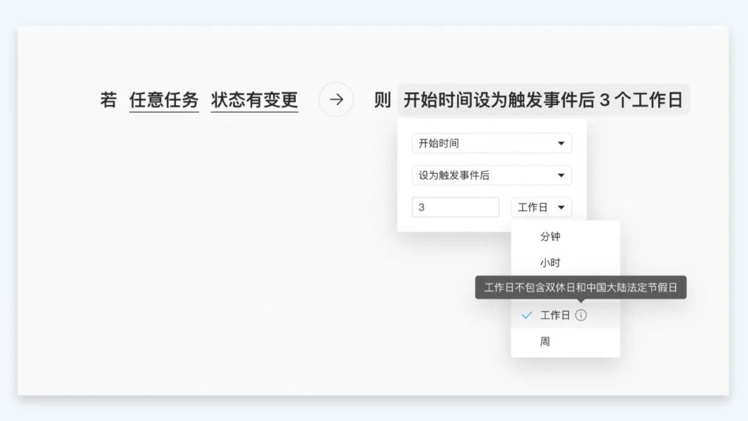 本次更新,Teambition「自动化」时间字段规则能力升级,用户进入自动化配置 - 设置执行动作环节 - 选择时间类型字段(如截止日期、开始日期等)- 选择「设为触发事件后」即可根据需求设置工作日的天数,更智能地安排任务执行时间。