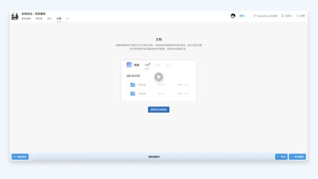 本次更新,我们支持在项目模板中预先配置「钉钉文档」相关设置,用户点击「项目菜单」-「保存为企业模板」进入项目模板配置界面 - 点击「菜单」- 更多设置 - 选择需要关联的「钉钉文档」知识库并与当前模板绑定,确保每个基于模板建立的新项目都能有对应的知识库。