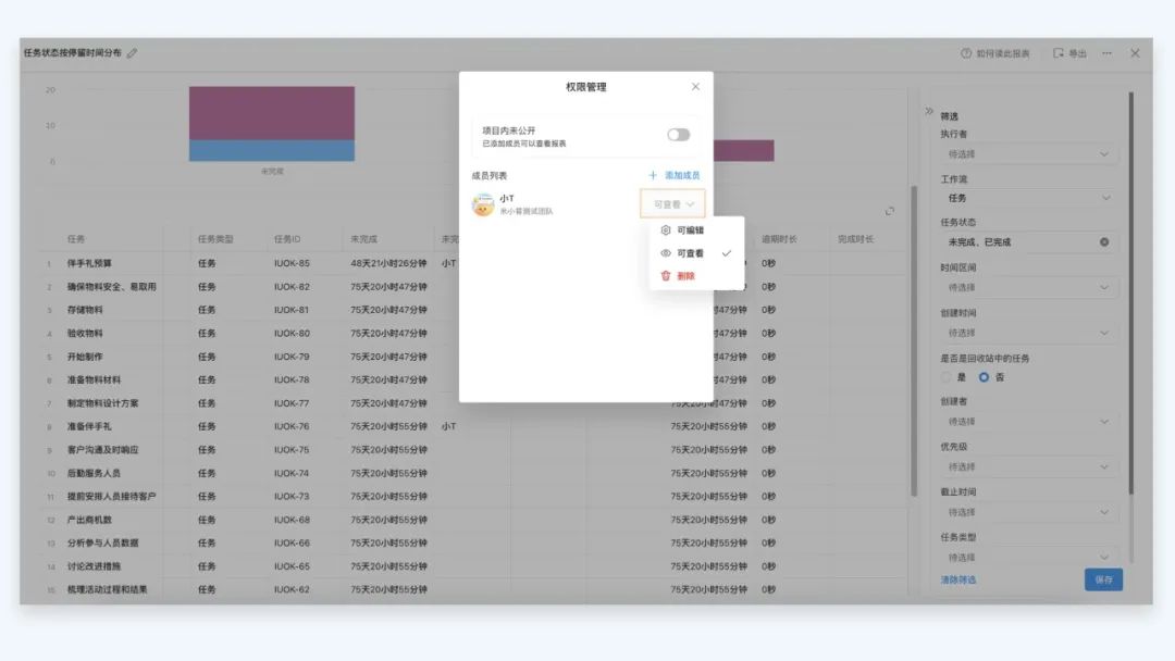 本次更新中,我们对「项目统计」报表权限设置进行了精细化调整。用户进入任一报表,点击「...」- 权限管理 - 支持管理员根据需求为不同成员设置可编辑或可查看的权限,提升了报表数据安全性。