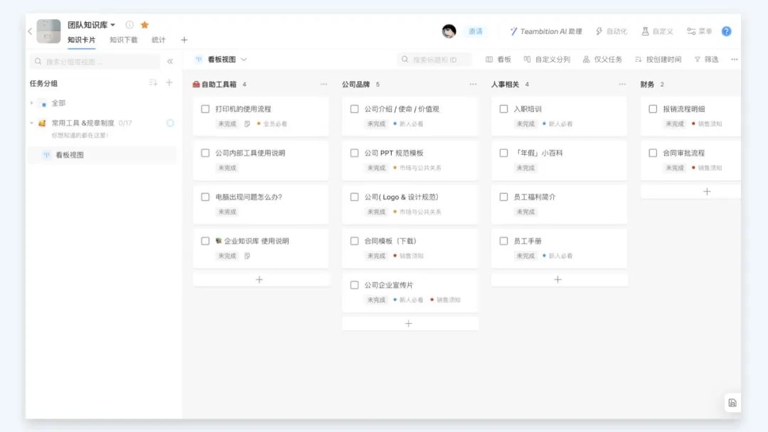 支持团队对公开信息进行目录索引式的管理,可以通过任务卡片的形式,轻松打造团队知识库,实现知识结构化管理,新人成长 so easy !
