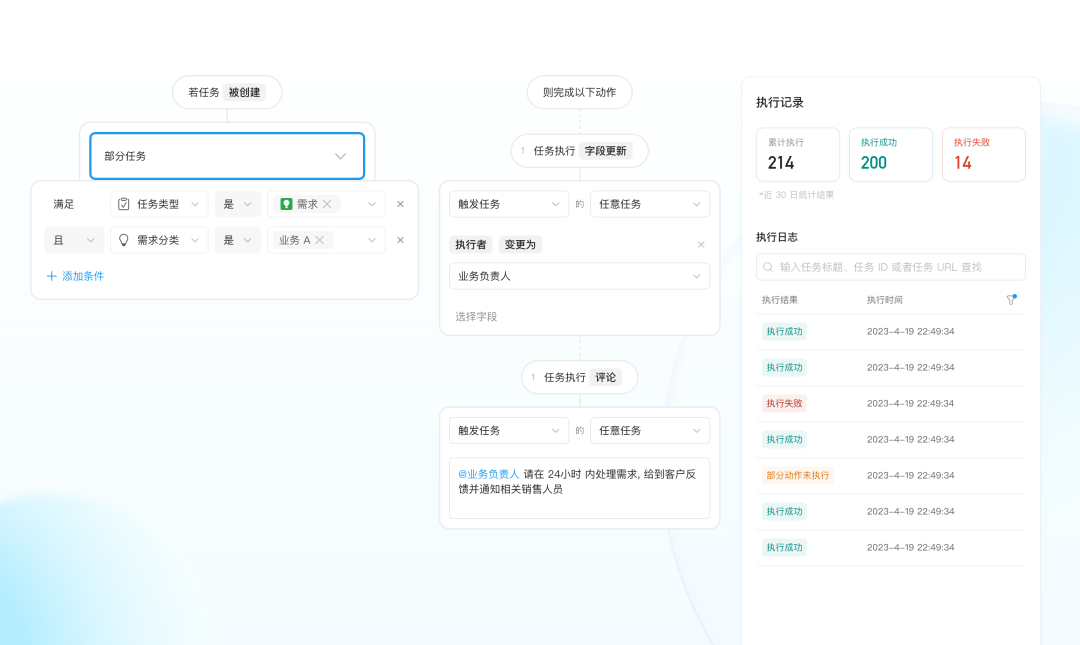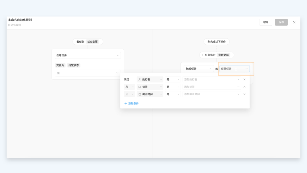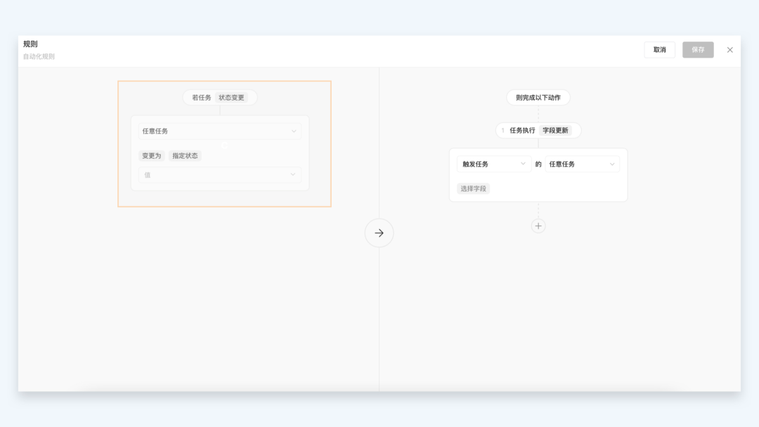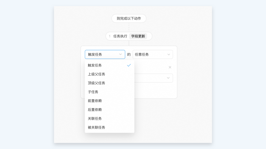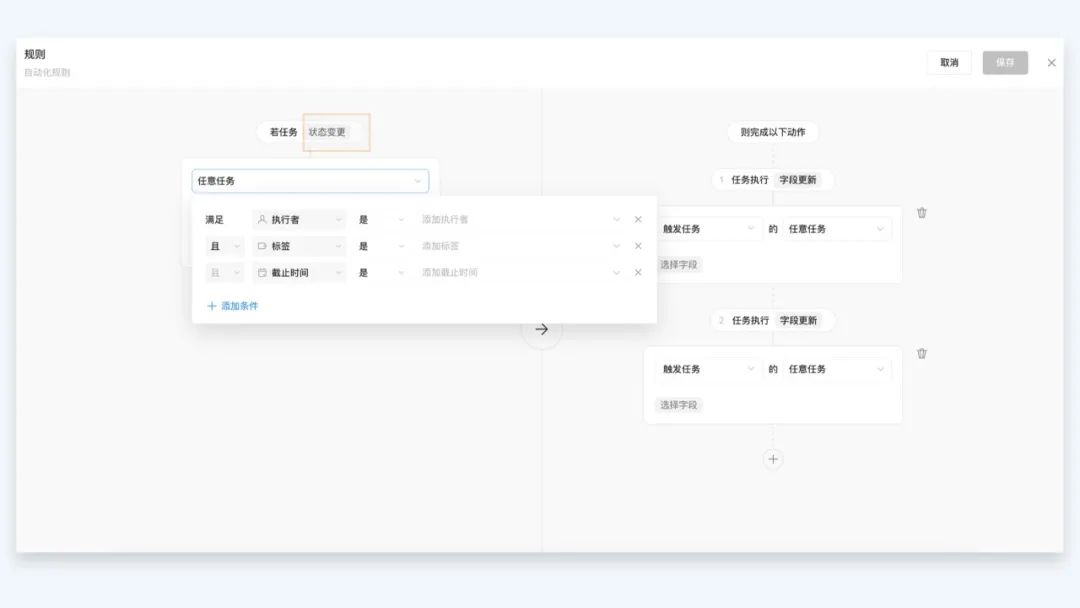 新版自动化支持跨任务执行能力(旗舰版),在任务之间巧妙穿针引线,实现任务之间的字段或状态变更联动。