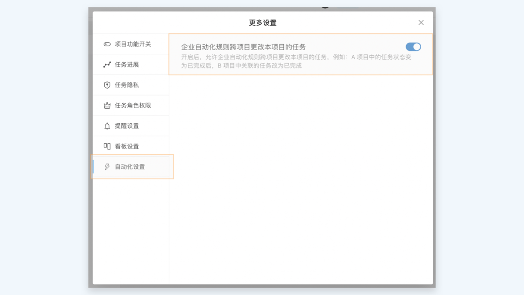 企业自动化还支持跨项目执行能力,不拘泥于项目边界,当在所需联动的项目中开启「允许企业自动化规则跨项目更改本项目的任务」时,即可实现跨项目自动同步任务信息和进度情况。协作无间,效率翻倍。