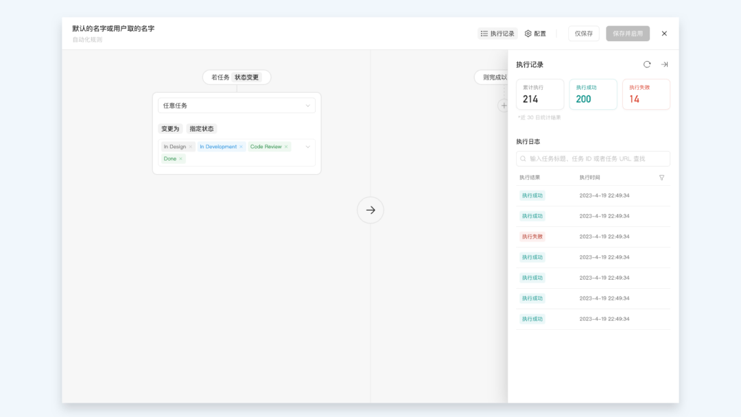 想要查看自动化历史执行记录?我们不仅提供了近 30 天累计执行、执行成功、执行失败的统计次数,更支持搜索任务标题、任务 ID 或任务 URL,查找某个任务在当前自动化规则中的执行记录。