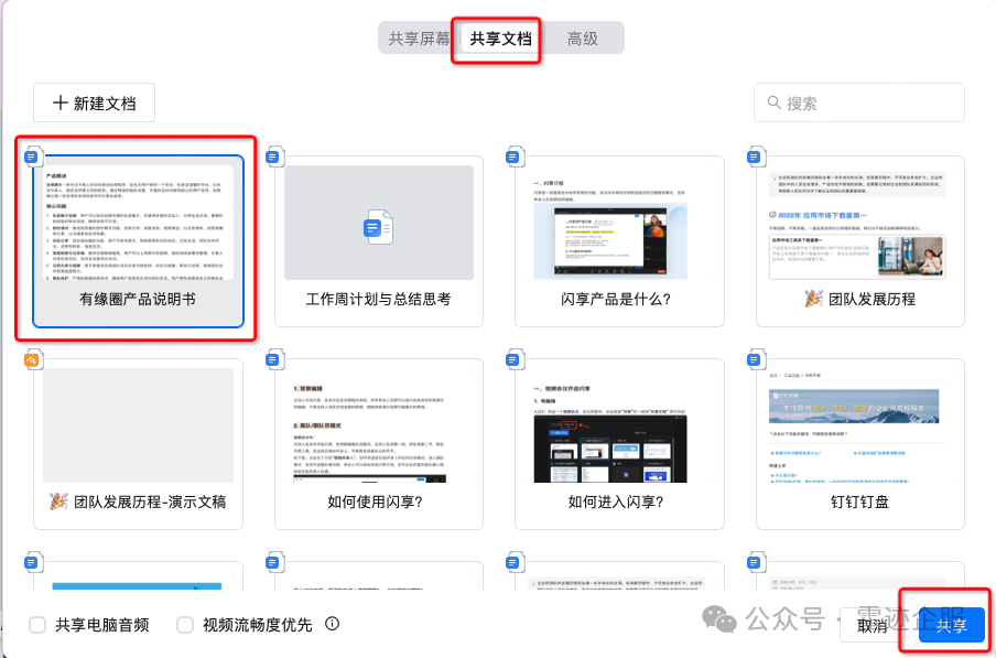 开启一个视频会议,在会议界面中,点击底部「共享」,选择「共享文档」 即可开启。