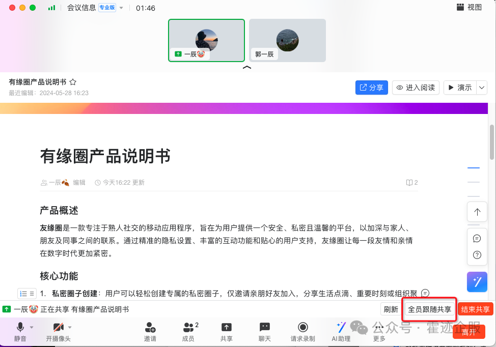👉在闪享中,主持人可开启全员跟随共享,开启后全部参会人员将,强制跟随主持人的共享内容和所在文档的位置。