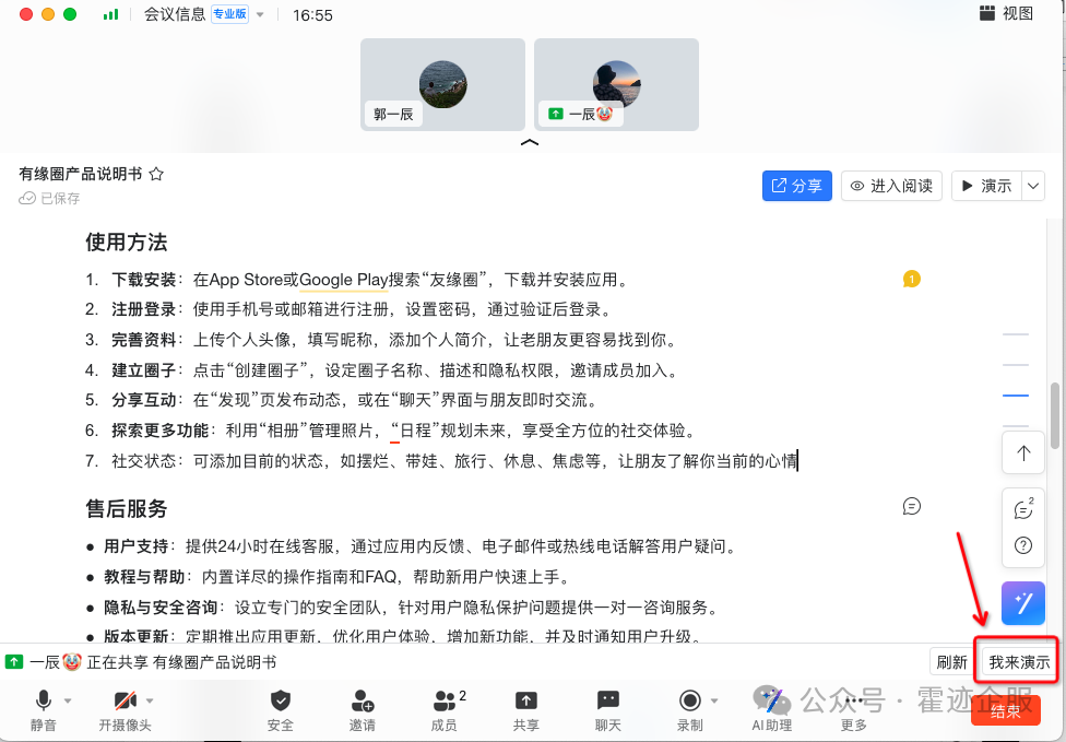👉 在视频会议中,参会人员点击右下方的「我来演示」,选择接力成为共享人进行投屏,这样无需重新加载文档,让会议流程不卡顿,演说灵感也不必重启。