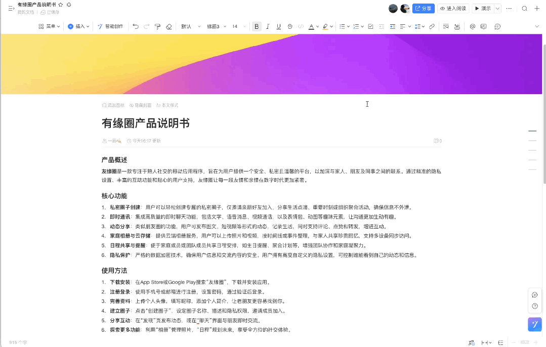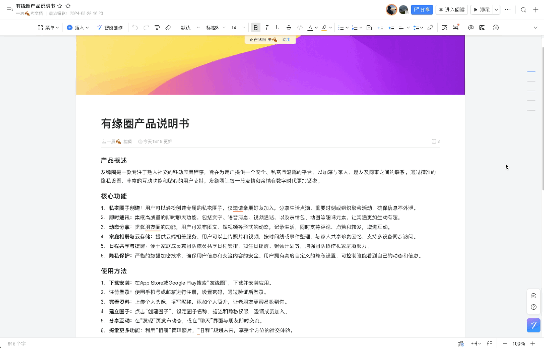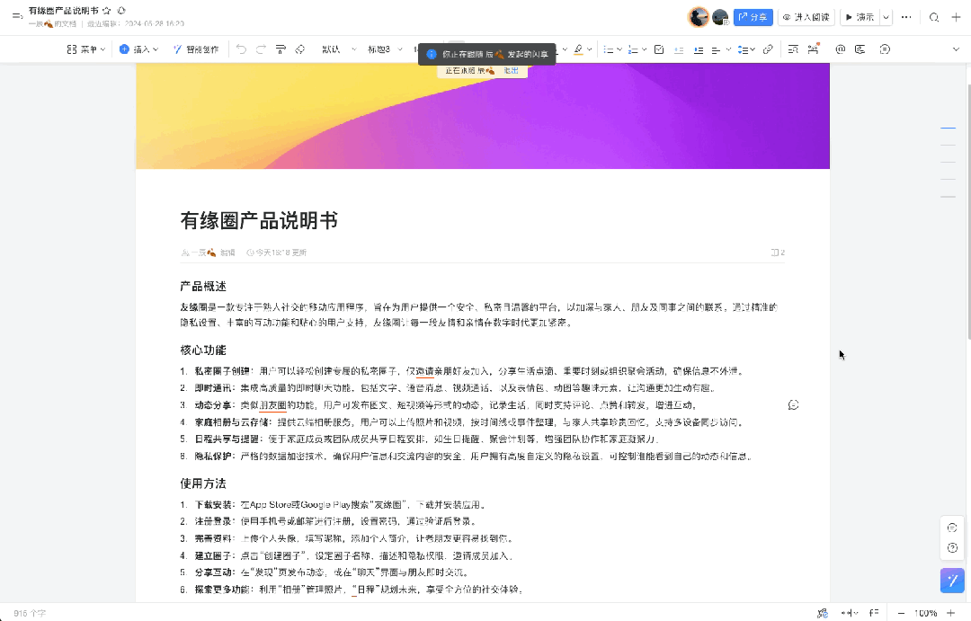 👉 此外,若想预览全文,可以自行滑动文档,当点击右侧共享人头像即可再次回到共享视角,讨论便不会轻易跟丢。