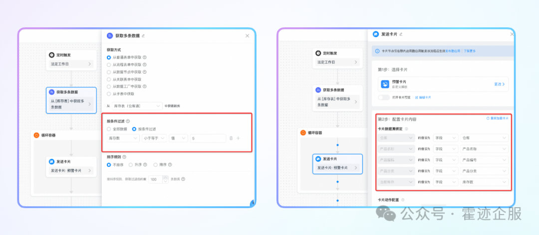 支持配置预警数据及卡片内容,发送卡片通知到库管(字段=仓库管理员)