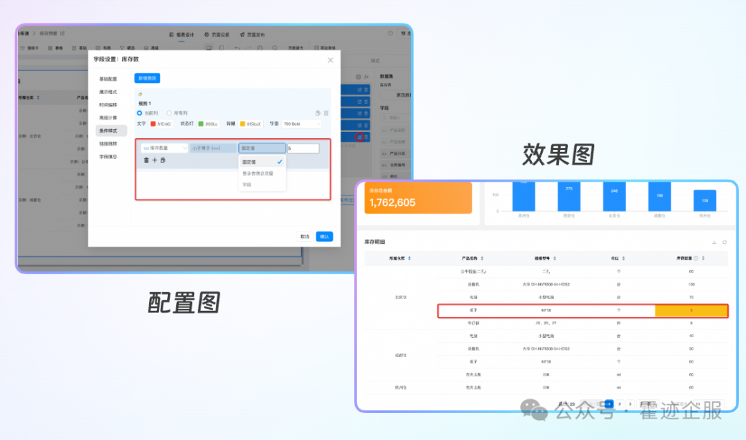 【场景】当库存数量<=5的时候,字段值将会特别显示。支持自定义特别显示内容:文字颜色、状态灯、背景色、字号粗细等属性(目前默认固定值=5)