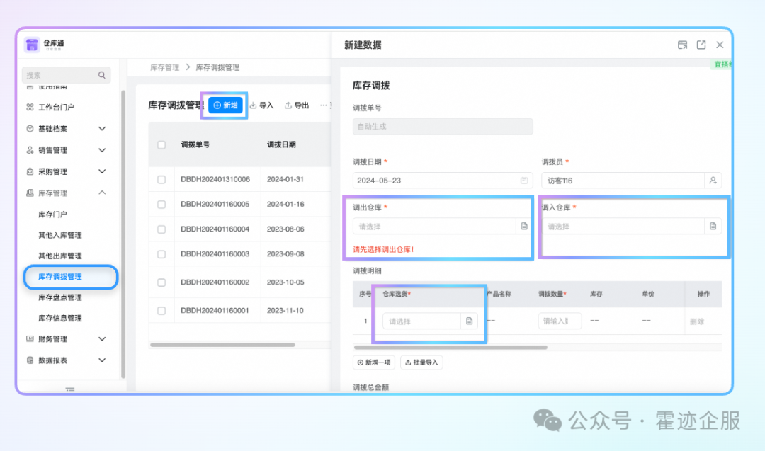 👉 新增 -> 选择调出/入仓库 -> 选择调拨产品和数量 -> 提交成功