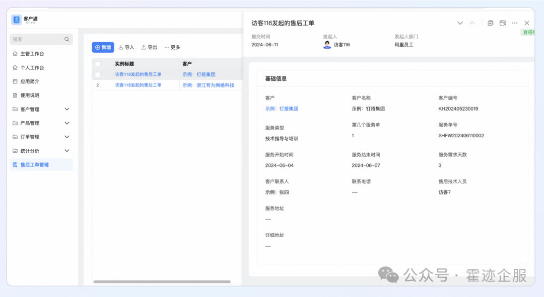 「客户通」提供的售后工单记录页面核心功能在于构建一个集约化、简明的管理枢纽,旨在手动输入及监控售后需求的起始数据,确保关键信息被精确记载与存档。此页面设计注重易用性与维护效率,展现出高度灵活性,不仅强化了当前的操作便利,也为后续的数据剖析与系统迭代预埋了坚实基础,彰显其在实践应用中的独特价值与适应能力。