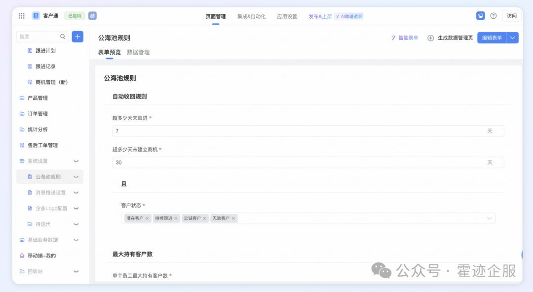 资源的高效再分配:通过自动化机制,使闲置客户资源回归公海池,进而激发全体销售人员对这些沉睡客户的重新探索。此策略不仅促进了企业内部的良性竞争与协作,还显著增强了客户触达的敏捷性与效能,体现了对资源的深度整合与智慧再部署。
