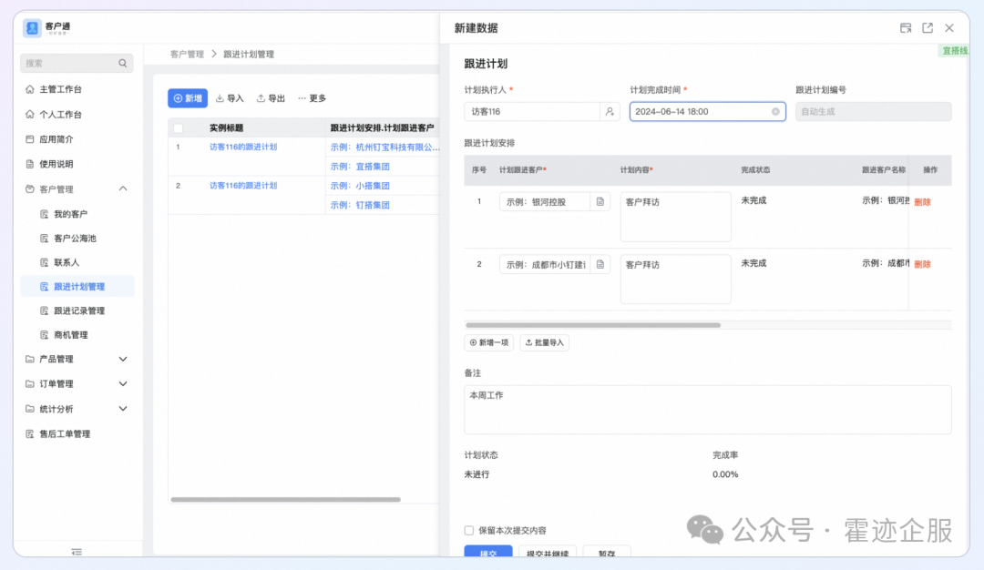 跟进计划分配功能赋予管理员及团队主管以优化资源配置的能力,使他们能够精确指派专人负责本月核心客户的追踪关注。此功能通过智能化的任务分派,确保团队成员聚焦于明确的跟进目标,进而增强客户交互的个性化与服务质效,有力推动业务流程的高效运行与客户满意度的稳步提升。