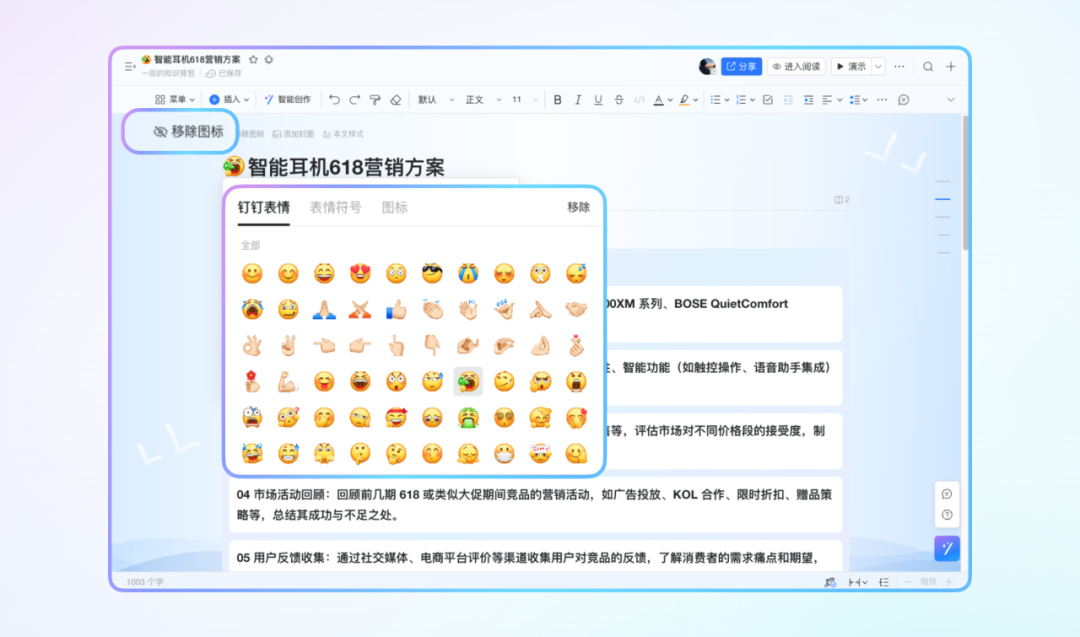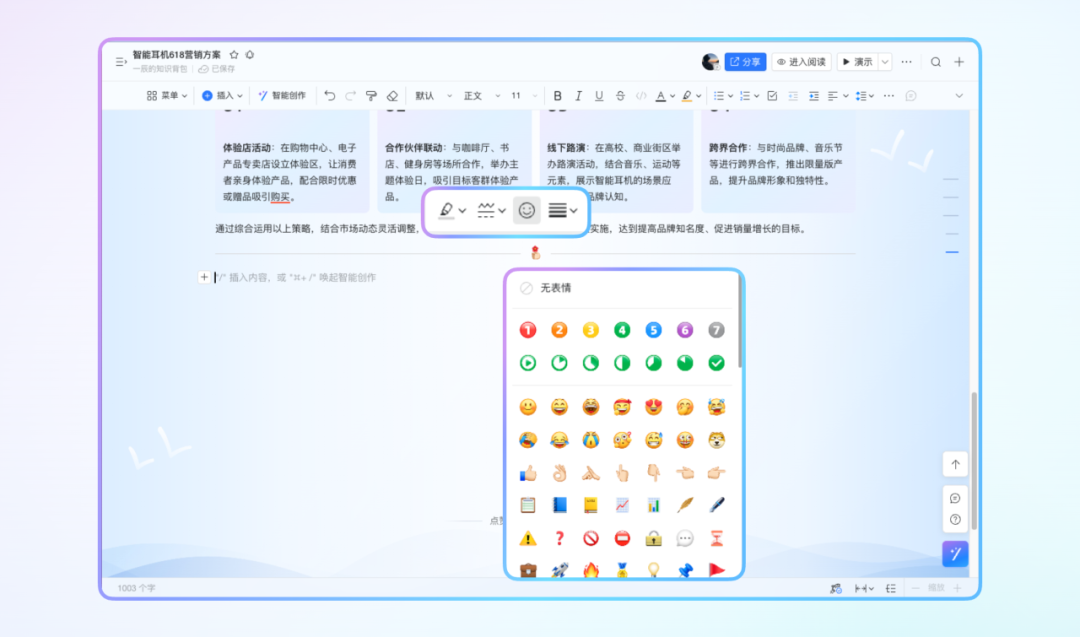 支持在添加分割线时设置表情,选择心仪的表情,让文档呈现更灵动,让效率与乐趣并行。