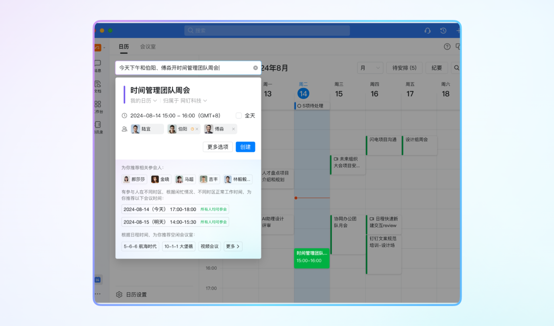 智能创建日程,支持自动推荐适配跨时区参会成员的会议时间,组织管理智能高效,企业出海畅通无碍。