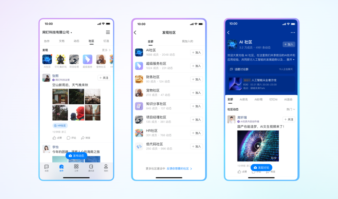 提供多元开放的交流空间,在这里,你可以获取钉钉最新产品动态和行业动态,自由讨论产品使用体验,和更多同行、同频朋友沟通交流。