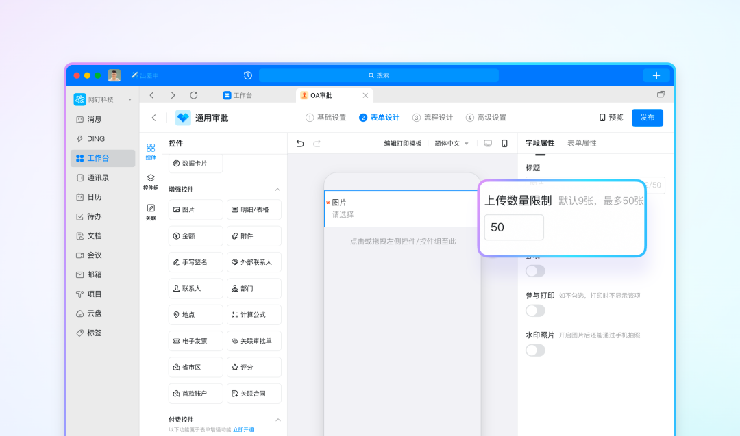 「图片」新增上传数量设置,默认支持 9 张,最大可选择 50 张,表单内容更详实,信息呈现更清晰。