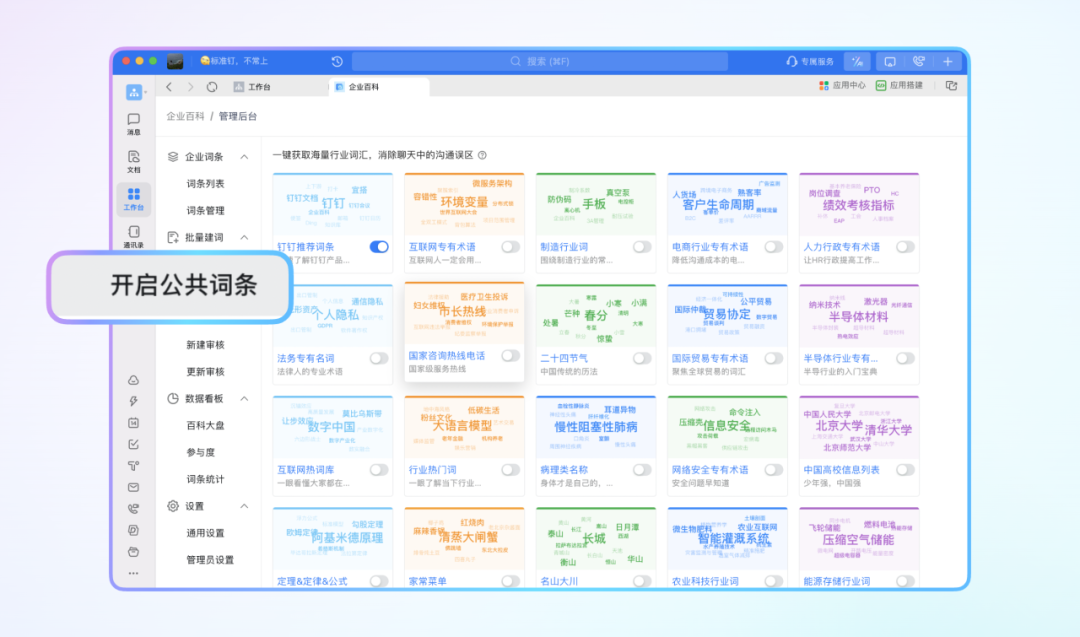 支持通过「管理后台」一键开启行业词包,海量词条助力你在聊天中快速查询释义,降低沟通成本,提升沟通效率。